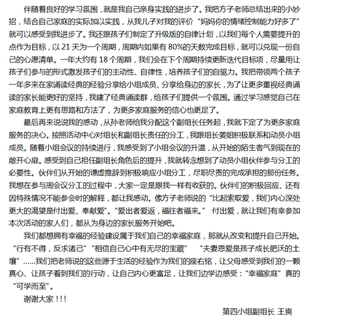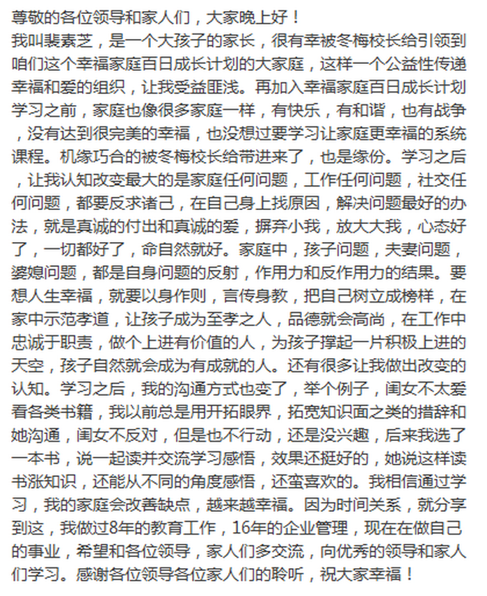 组长代表分别和大家分享学习心得,从学习中我们懂得了修心的重要性,改变了自己的认知,尤其是与家人的沟通方式,让家人之间更和谐融洽,以身作则,成为孩子的榜样,用行动建设幸福家庭。