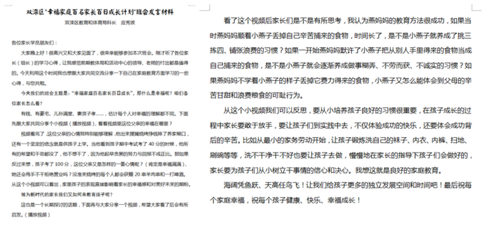 双滦区教育和体育局教育科应秀波科长和我们分享的《父亲》视频,深深触动着所有家长的心,从这个小视频可以看出,家里孩子的表现直接影响着家长的幸福感和对美好未来的期盼。我们应该向《小燕子》视频中的燕妈妈一样,敢于放手,在孩子成长的过程中家长要敢于放手,要让孩子们到实践中去,不仅体验成功的快乐,还要体会成功背后的辛苦。最后应科长用“海阔凭鱼跃天高任鸟飞”来告诉大家,给孩子发展空间,孩子一定会越来越好!
