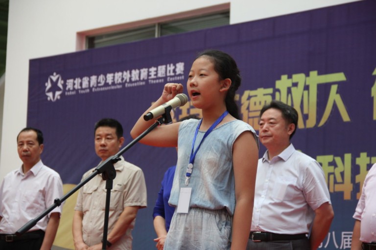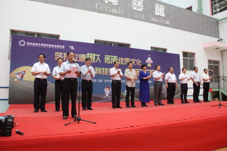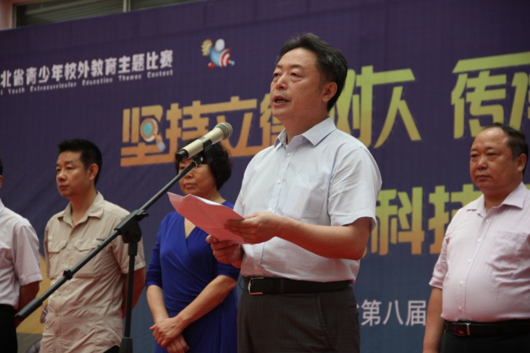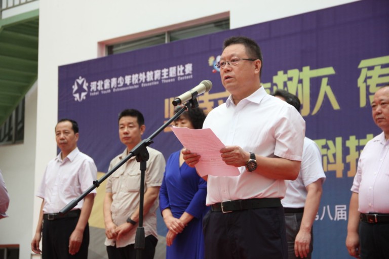 河北省青少年校外教育研究会会长葛素梅宣布河北省第八届“校外教育杯”系类主题比赛“创新思维”项目决赛开幕。
