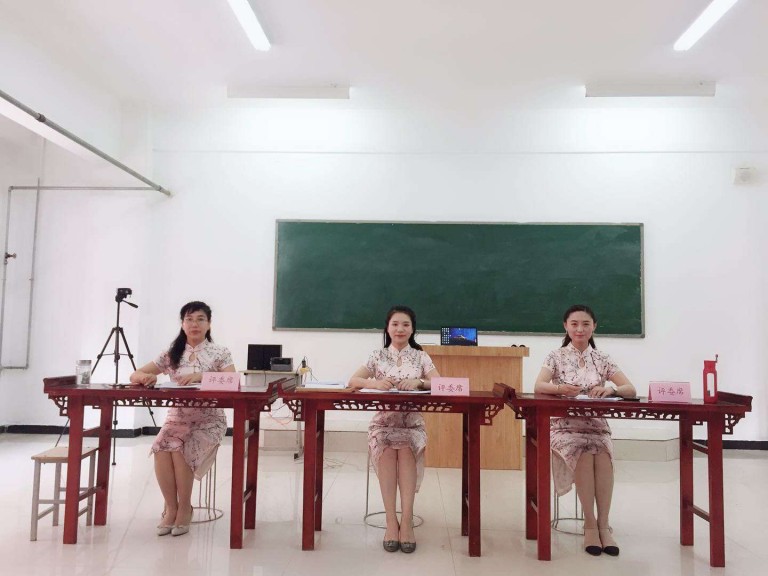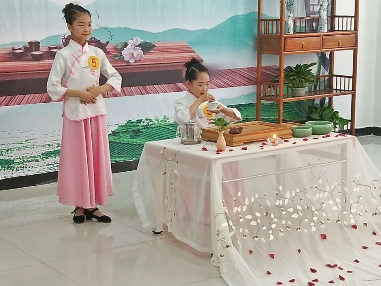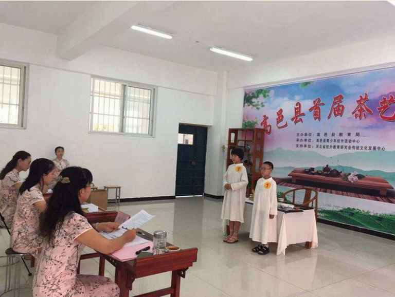 来自省校外研究会的茶艺专家老师杜海荣、赵诗雨、紧张有序的对高邑县的茶艺小选手进行评估中