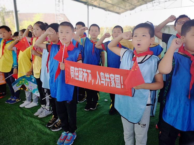 在领誓人带领下,学生们庄严地举起右手宣誓:我是爱鸟护鸟小志愿者,爱我祖国,振兴中华;爱我家乡,奋发图强;爱我少年,阳光成长;鸟类和野生动物是我们的朋友,科学爱鸟护鸟是我们的责任,让我们手牵手爱鸟护鸟,心连心共建生态家园。