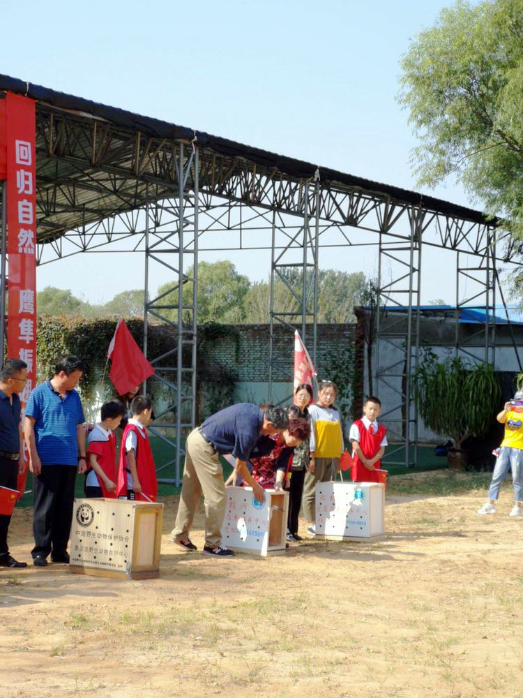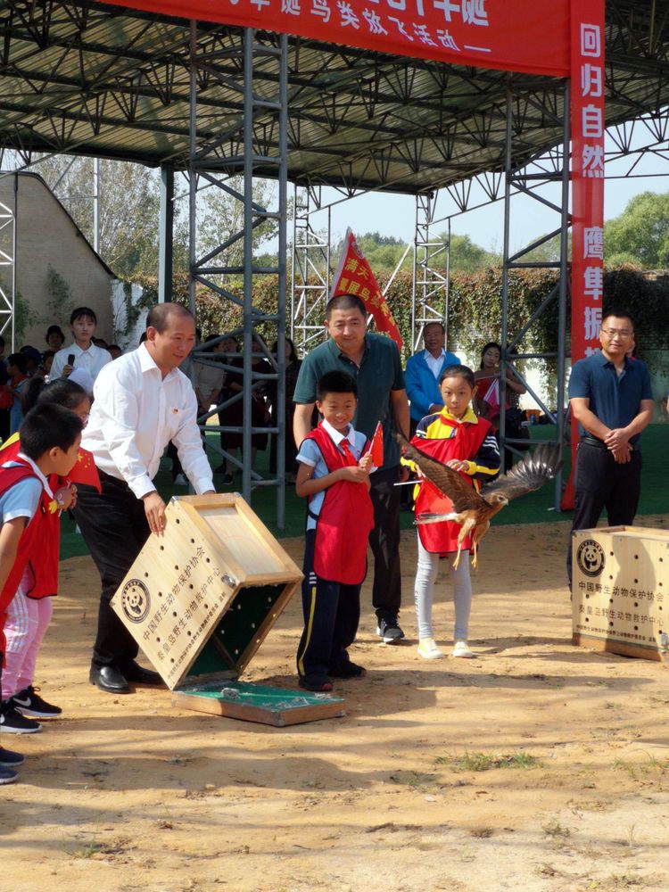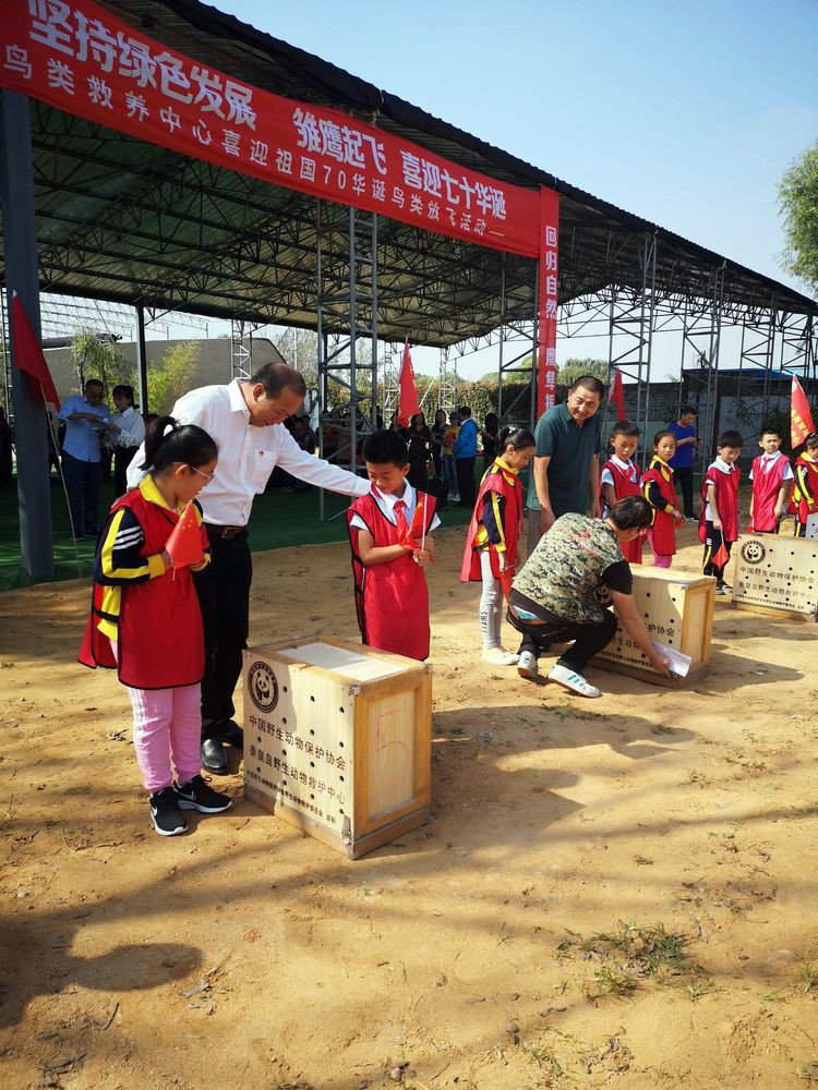伴随着《飞得更高》的音乐声,参会领导与可爱的孩子们共同放飞鸟类。本次活动放飞的鸟是已经报区林业局主管部门批准可以放飞的,它们是:白鹭,红隼,普通鵟,日本松雀鹰,纵纹腹小鸮。
