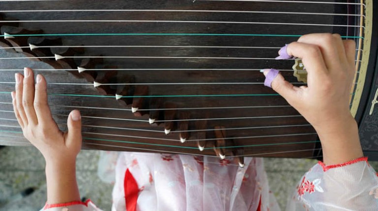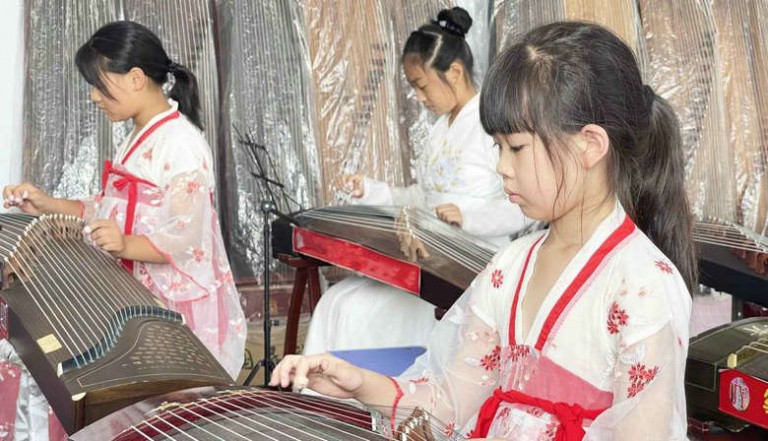 图为孩子们在邢台沙河市青少年活动中心体验学习古筝弹奏。